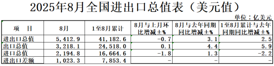2025年1—8月,我国进出口总值4.12万亿美元,增长2.5%。其中,出口2.45万亿美元,增长5.9%;进口1.67万亿美元,下降2.2%